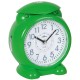 Quarz-Kinderwecker, Kunststoffgehäuse grün, Repetition, umschaltbar von Glockensignal auf Melodie, blinkende und wechselnde Beleuchtung bei ertönen des Wecksignals, wechselnde Lichtfunktion mit Nachleuchteffekt bei jedem Tastendruck, arabische Zahlen blau, Zeiger schwarz, Sekundenzeiger silberfarben, Höhe ca. 13cm, Breite ca. 11cm