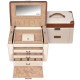 Schmuckkoffer Travel, Lederimitat creme/braun, innen hochwertiger Veloursamt beige, ausgestattet mit 2 Ringpolster und 3 kleineren Fächern (1 davon mit Klappdeckel) im oberen Fach, 3 geräumige Schubfächer, 1 davon geteilt, 1 Fach mit 4 federnden Uhrenspangen, 2 herausnehmbare Seitenfächer mit je 17 Haken für Ketten, Spiegel im Deckel mit Rüschentasche, mit Tragegriff und abschließbarem Schloss, Höhe ca. 21cm, Breite ca. 26,5cm, Tiefe ca. 20cm, Gewicht ca. 2065,2g