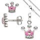 Schmuck-Set, bestehend aus: Kinder-Anhänger Krone aus 925/-Sterlingsilber, rhodiniert, mit Zirkonia und rosafarbener Lackeinlage, Höhe ca. 10,8mm, Breite ca. 9,7mm, Tiefe ca. 2,6mm, Innenmaße der Öse ca. 3,4mm x 2,7mm, Gewicht ca. 0,9g, 1 Paar Kinder-Ohrstecker Krone aus 925/-Sterlingsilber, rhodiniert, mit Zirkonia und rosafarbener Lackeinlage, Höhe ca. 6,7mm, Breite ca. 8mm, Gewicht ca. 1,2g, Panzerkette aus 925/-Sterlingsilber, rhodiniert, mit Karabinerverschluss, Länge ca. 38cm, Kettenstärke ca. 1,7mm x 0,8mm, Gewicht ca. 2,9g