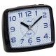 Quarz-Wecker, Kunststoffgehäuse schwarz, Repetition (Weckwiederholung alle 4 Minuten), Crescendo (ansteigendes Wecksignal), Obenabsteller, Lichtfunktion blau mit Nachleuchteffekt, weißes Zifferblatt, Punktskala und arabische Zahlen blau, Zeiger schwarz, schleichende Sekunde (geräuscharm) silberfarben, Höhe ca. 8,5cm, Breite ca. 10cm, Tiefe ca. 4cm, Gewicht ca. 114,6g