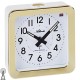 Funk-Wecker, Kunststoffgehäuse goldfarben/weiß, viereckig, Repetition (Weckwiederholung alle 5 Minuten), Crescendo (ansteigendes Wecksignal), seitlicher Alarmschalter, geräuscharmes Laufwerk, Lichtfunktion mit Nachleuchteffekt, Weckstandsanzeige, weißes Zifferblatt, Punkt-/Strichskala, arabische Zahlen und Zeiger schwarz, Höhe ca. 9,5cm, Breite ca. 9,5cm, Tiefe ca. 3,5cm, Gewicht ca. 115,6g