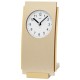 Quarz-Tischuhr, Holzgehäuse mit Aluminium messingfarben kombiniert, weißes bedrucktes Zifferblatt, Strichskala, arabische Zahlen und Zeiger schwarz, Höhe ca. 19 cm, Breite ca. 10 cm, Tiefe ca. 10 cm, ca. 246,0 g