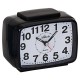 Quarz-Wecker, Kunststoffgehäuse schwarz, Repetition (Weckwiederholung alle 4 Minuten), Crescendo (ansteigendes Wecksignal), seitlicher Alarmschalter, Lichtfunktion, weißes Zifferblatt, Punktskala, arabische Zahlen und Zeiger schwarz, schleichende Sekunde (geräuscharm) grau, Höhe ca. 8,5cm, Breite ca. 11cm, Tiefe ca. 6,5cm, Gewicht ca. 121,7g