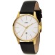 Herrenarmbanduhr, JOBO-Quarz-Analog, Gehäuse und Boden Edelstahl, vergoldet, mattiert, Mineralglas, Zentralsekunde, Datumsanzeige, Strichskala, wassergeschützt bis 3 ATM, schwarzes Lederband mit Dornschließe, Miyota-Werk (ca. 35,0g), Ø ca. 39mm, Tiefe ca. 7,1mm, Länge ca. 210mm, Anstoß 20mm