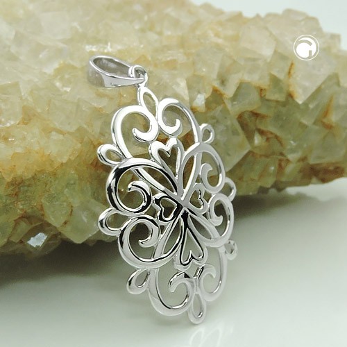 Wunderschöner 27x19mm großer Anhänger in 925/- Sterlingsilber, gearbeitet in hochwertiger Juwelierqualität. Das orientalisch angehauchte filigrane Muster ist beidseitig glatt glänzend und der gesamte Anhänger leicht gewölbt. Für langanhaltende Freude an diesem zeitlos schönen Schmuckstück wurde die Oberfläche anlaufgeschützt rhodiniert. Wenn auch Sie sich von diesem Schmuck magisch angezogen fühlen, verschenken Sie ihn doch an die bezauberndste Frau, die Sie kennen.