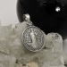 St. Benediktus-Medaille in 925er Sterlingsilber, doppelseitiges, geprägtes Motiv, geschwärzt, alle Buchstaben und Wörter sind klein, aber gut erkennbar. Lateinisch: Eius in obitu nostro praesentia muniamur steht für: Mögen wir Stärke finden durch Seine Gegenwart in der Stunde unseres Todes . Auf der Rückseite ist das Benediktus-Kreuz dargestellt mit vielen Sprüchen bzw. Abkürzungen in Latein. Es sind Segensformeln für den Heiligen Benekdikt, die vor Unheil aller Art schützen sowie bei Geburten und in der Sterbestunde helfen sollen. Auf dem Kreuz steht: - im Längsbalken: CSSML für Crux Sacra Sit Mihi Lux - Das heilige Kreuz möge mein Licht sein - im Querbalken: NDSMD für Nunquam Draco Sit Mihi Dux - Möge der Drache nie mein Führer sein - über dem Kreuz: PAX - Frieden - in den vier Kreuzwinkeln: CSPB für Crux Sancti Patris Benedicti – Kreuz des heiligen Vaters Benedikt - auf dem äußeren Rand: VRSNSMVSMQLIVB für Vade Retro Satana, Nunquam Suade Mihi Vana, Sunt Mala, Quae Libas: Ipse Venena Bibas - „Weiche zurück Satan, führe mich niemals zur Eitelkeit. Böse ist, was du mir einträufelst: trinke selbst dein Gift