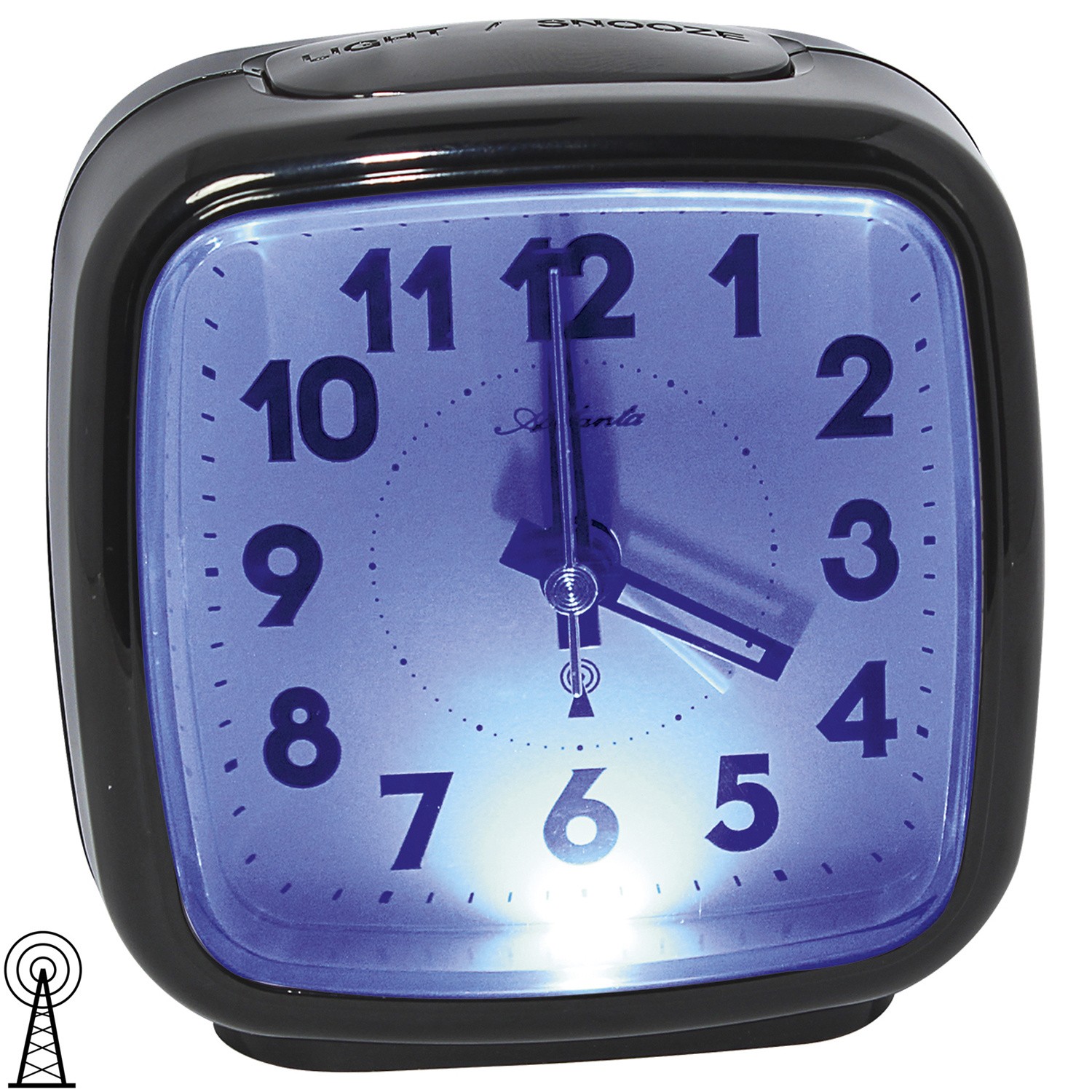 Funk-Wecker, Kunststoffgehäuse schwarz, Repetition (Weckwiederholung alle 5 Minuten), Crescendo (ansteigendes Wecksignal), seitlicher Alarmschalter, Lichtfunktion mit Nachleuchteffekt, weißes Zifferblatt, Strichskala, arabische Zahlen und Zeiger schwarz, Sekundenzeiger silberfarben