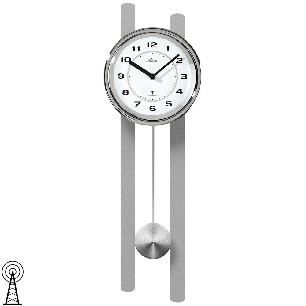 Funk-Wanduhr mit Pendel, Holz silberfarben lackiert mit Metall kombiniert, Mineralglas, weißes bedrucktes Zifferblatt, Punktskala, arabische Zahlen und Zeiger schwarz
