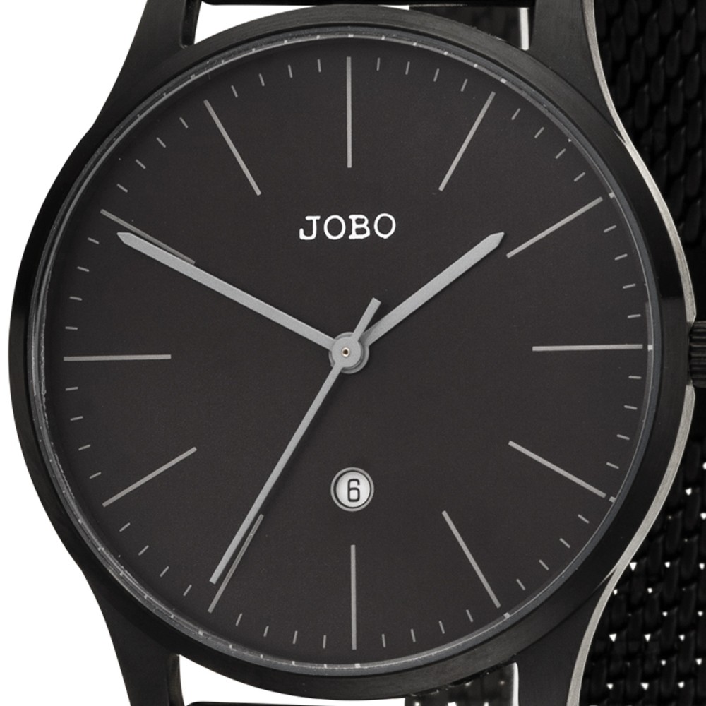 Damenarmbanduhr, JOBO-Quarz-Analog, Gehäuse, Band und Boden Edelstahl, schwarz plattiert, mattiert, Mineralglas, Zentralsekunde, Datumsanzeige, schwarzes Zifferblatt, Strichskala, wassergeschützt bis 3 ATM, Klappverschluss, verkürzbar, Miyota-Werk