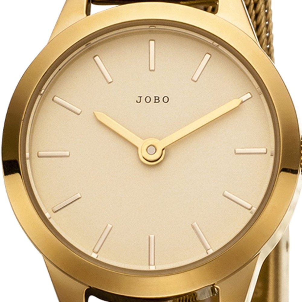 Damenarmbanduhr der Marke JOBO, Quarz-Analog, Gehäuse, Band und Boden Edelstahl, vergoldet, Mineralglas, Strichskala, wassergeschützt bis 3ATM, mit Klappverschluss, verkürzbar, Miyota-Werk, Bandlänge ca. 20 cm