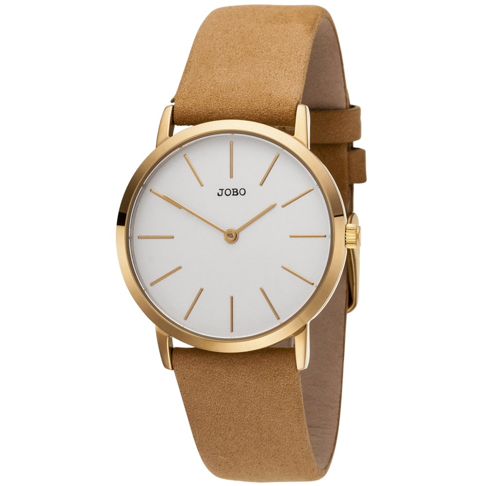 Damenarmbanduhr der Marke JOBO, Quarz-Analog, Gehäuse und Boden Edelstahl, vergoldet, Mineralglas, Strichskala, wassergeschützt bis 3 ATM, Lederband beige mit Dornschließe, Miyota-Werk, Bandlänge ca. 19,5 cm