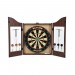 Antik-braun gebeiztes Massivholz mit farbigem Aufdruck auf der Vorderseite. Die Flügeltüren sind mit Magnetverschluss sowie einer Punktzähltafel versehen, imklusive abwischbarfem Filzstift mit Tuch. Lieferung ohne Dartboard.
