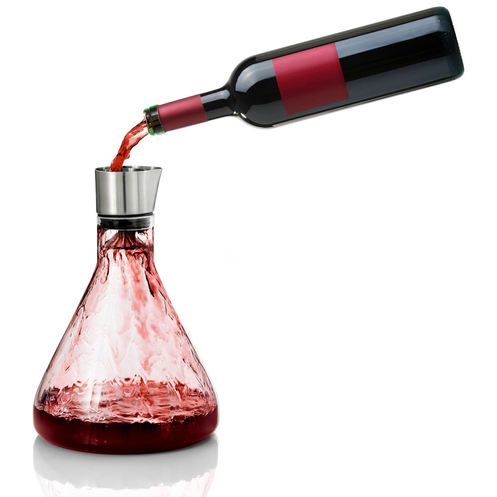 Dekantierkaraffe DELTA, Glas mit Edelstahl matt kombiniert, Silikon. Der Wein wird beim Befüllen der Karaffe gefiltert und belüftet. Ohne das Sieb zu säubern, kann ausgegossen werden und der Weinstein verbleibt im Sieb. Völlig tropffreies Ausgießen. Design: Flöz Industriedesign