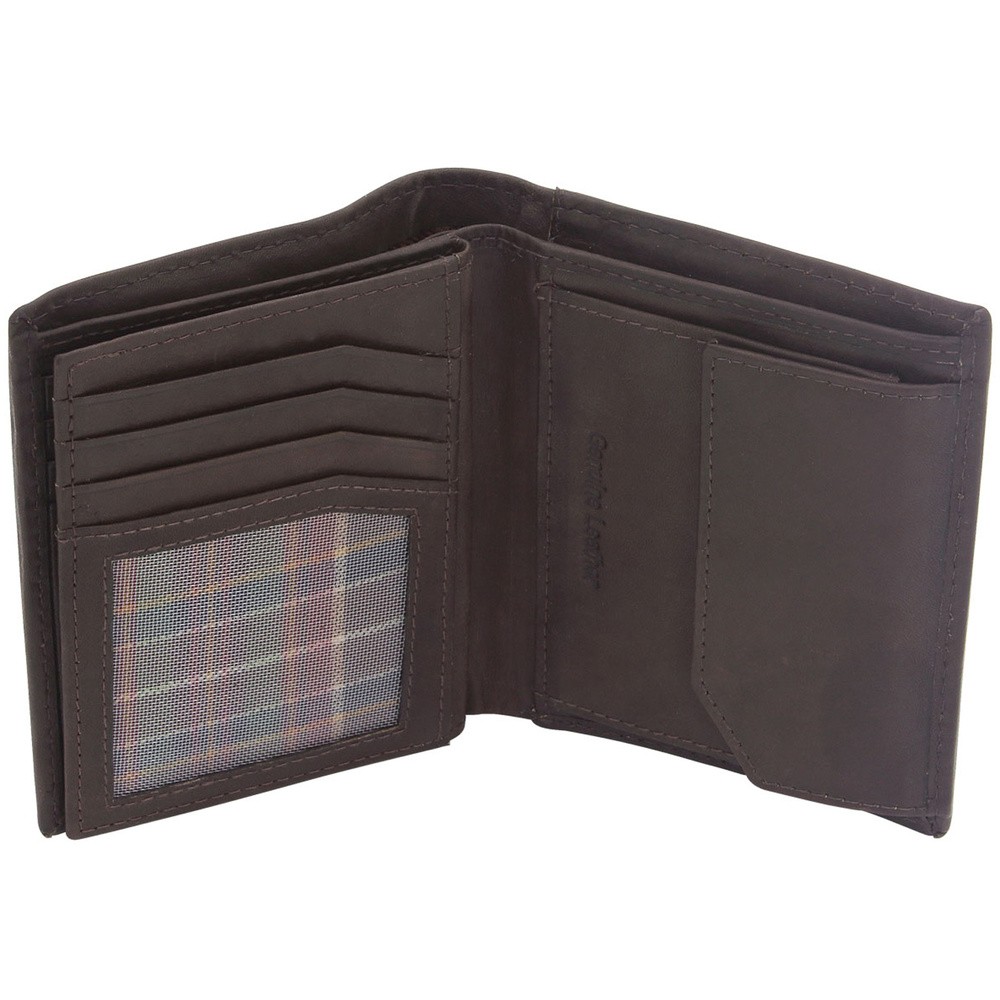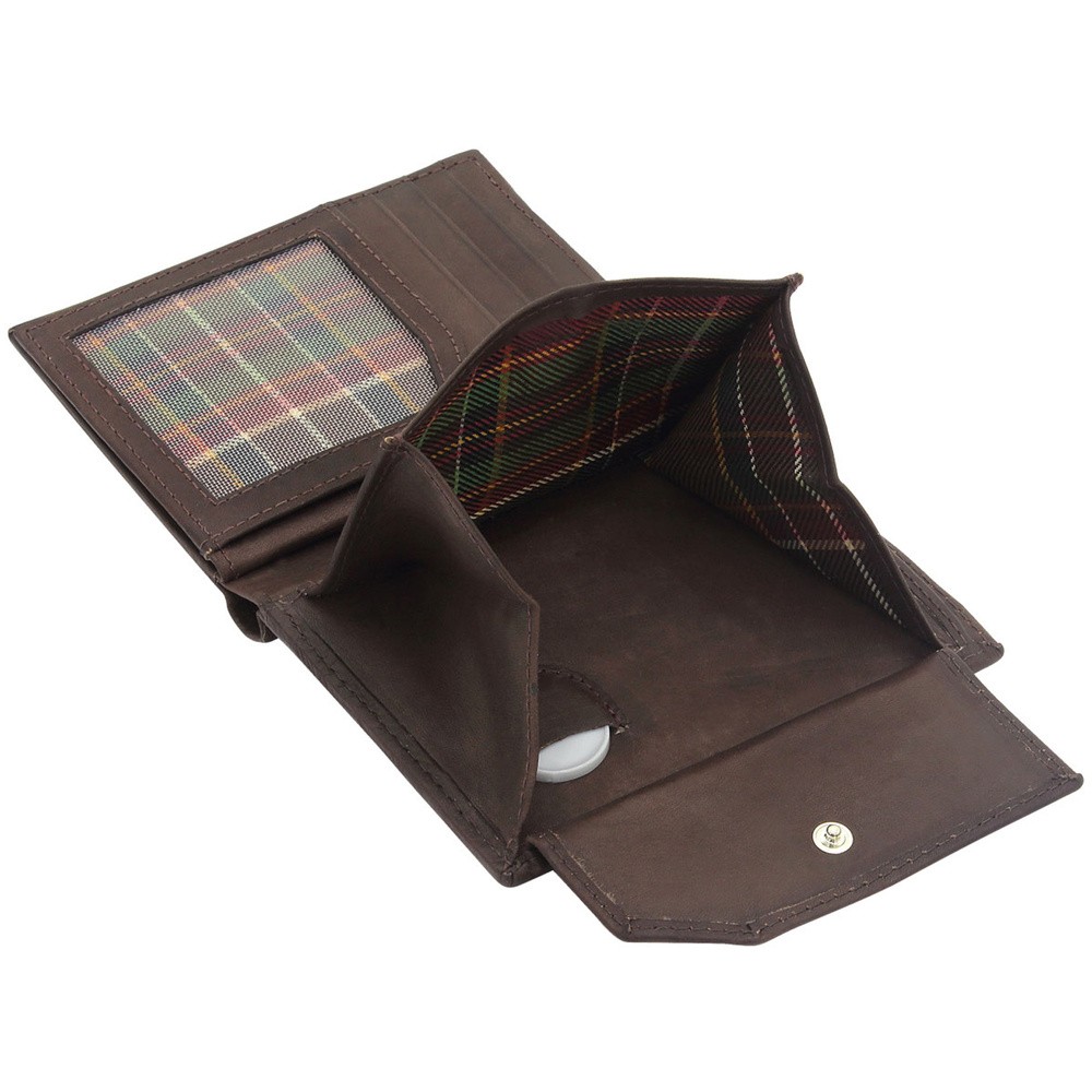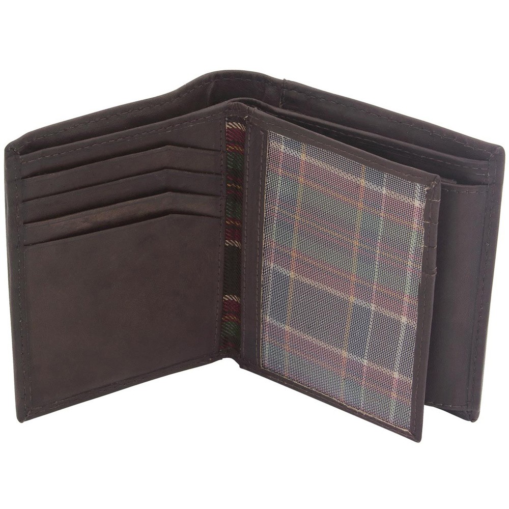 Geldbörse, Leder dunkelbraun, Karofutter, mit eingearbeitetem Einkaufswagenchip im großen Hartgeldfach, 2 Scheinfächer, 7 Kartenfächer, 2 Netzgitterfächer, 3 Steckfächer innen, 1 Steckfach außen, mit Datenschutz (RFID-SAFE = kein auslesen persönlicher Daten möglich)