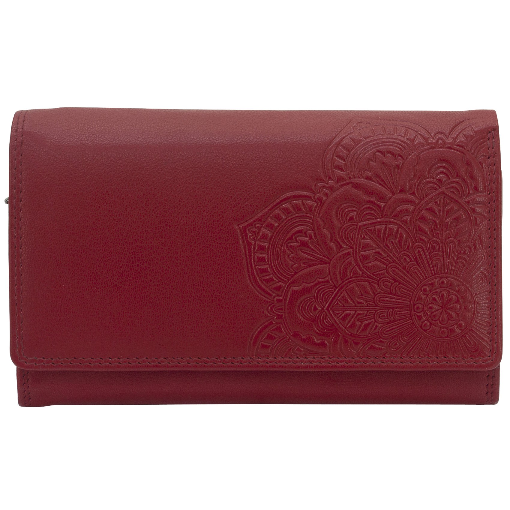 Geldbörse Mandala, Lamm-Nappa-Leder rot, mit Mandala-Prägung, 3 Scheinfächer, 1 XXL Scheinfach, 1 großes, zweigeteiltes Reißverschluss-Hartgeldfach mit Steckfächern für Einkaufschip und Schlüssel, 3 große Steckfächer, 1 großes Reißverschlussfach, 12 Steckfächer für Kreditkarten, 2 Netzgitterfächer, großes Steckfach auf der Rückseite, Geldbörse mit Druckknopf zu schließen, mit Datenschutz (RFID-SAFE)