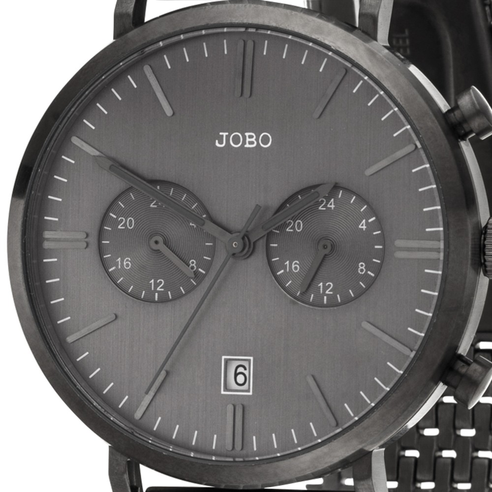 Herrenarmbanduhr, JOBO-Quarz-Analog, Gehäuse, Band und Boden Edelstahl, mattiert, anthrazit plattiert, Mineralglas, Zentralsekunde, Datumsanzeige, kleine 24-Stundenanzeige, zweite Zeitzone einstellbar, anthrazitfarbenes Zifferblatt, Strichskala, wasserdicht bis 5 ATM, Faltschließe, verkürzbar
