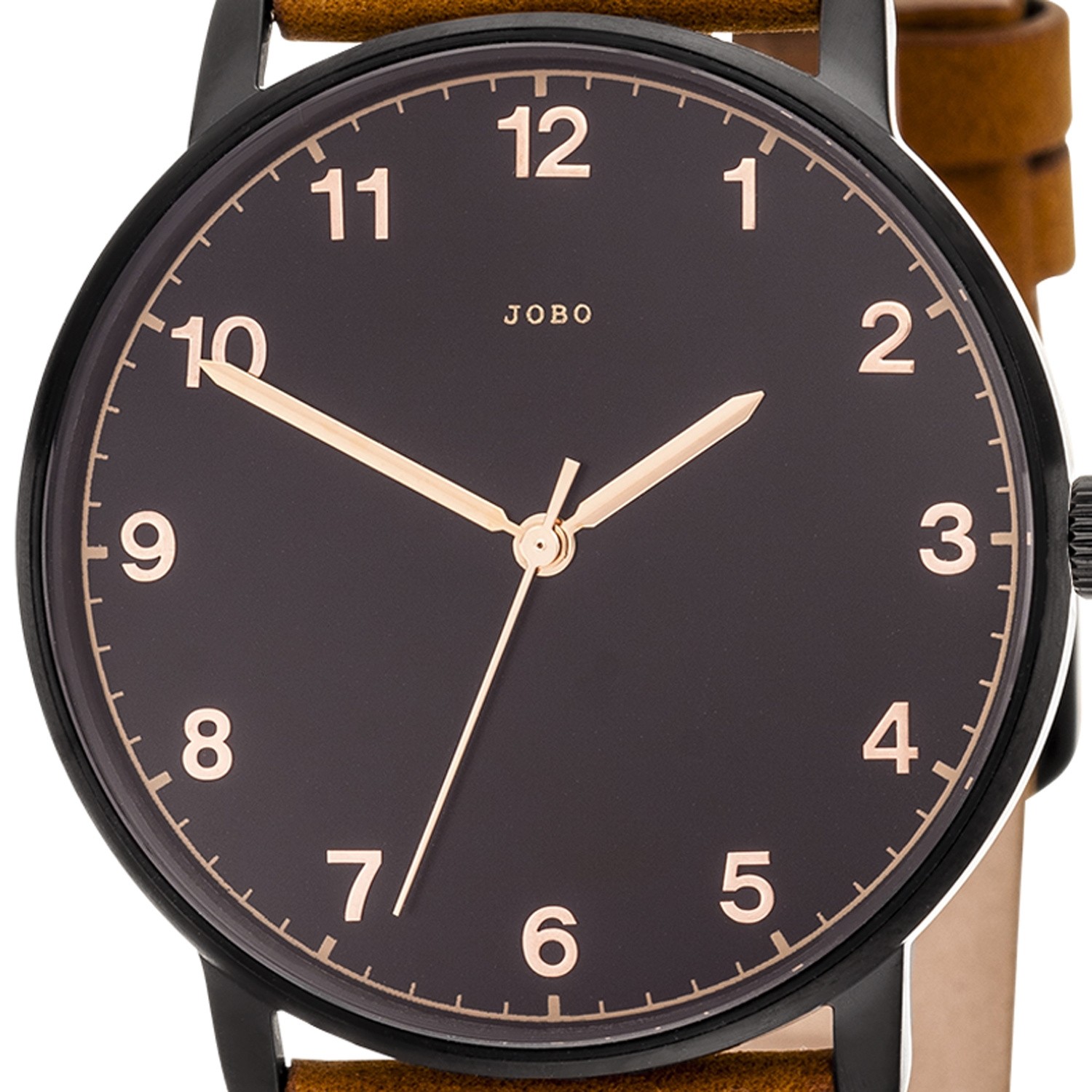 Herrenarmbanduhr der Marke JOBO, Quarz-Analog, Gehäuse und Boden Edelstahl, schwarz plattiert, Mineralglas, Zentralsekunde, schwarzes Zifferblatt, arabische Zahlen, wassergeschützt bis 3 ATM, braunes Lederband mit Dornschließe, Miyota-Werk, Bandlänge ca. 21cm