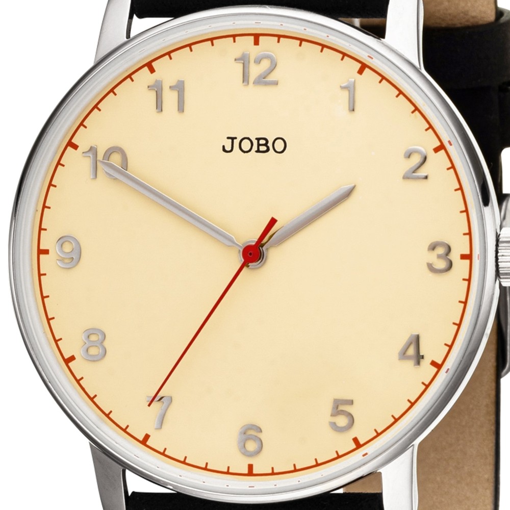 Herrenarmbanduhr, JOBO-Quarz-Analog, Gehäuse und Boden Edelstahl, Mineralglas, rote Zentralsekunde, cremefarbenes Zifferblatt, arabische Zahlen, wassergeschützt bis 3 ATM, schwarzs Lederband mit Dornschließe, Miyota-Werk