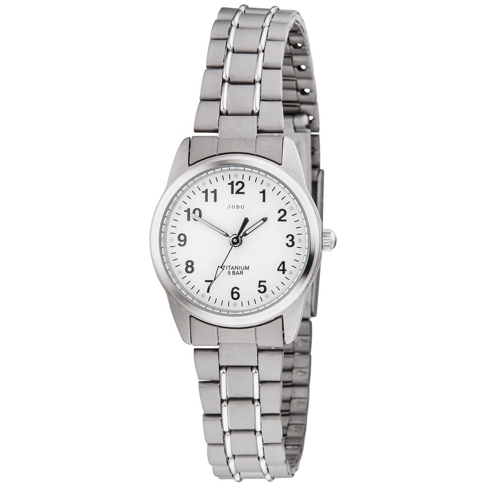 JOBO Damen Armbanduhr Quarz Analog Titan DamenuhrDamenarmbanduhr der Marke JOBO- Quarz-Analog- Gehäuse- Band und Boden Titan- teilmattiert- Mineralglas- Zentralsekunde- weißes Zifferblatt- arabische Zahlen- wasserdicht bis 5 ATM- Faltschließe- verkürzbar- Bandlänge ca. 20 cm