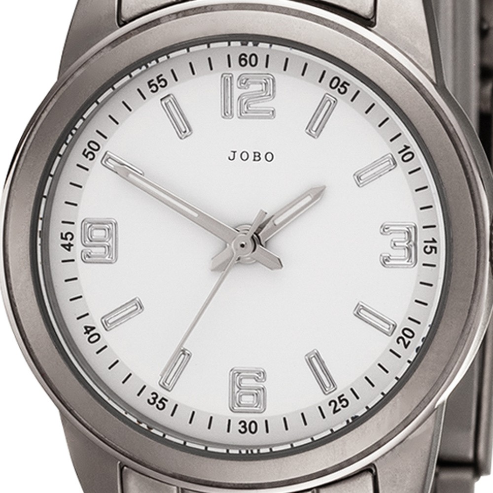 JOBO Damen Armbanduhr Quarz Analog Titan DamenuhrDamenarmbanduhr der Marke JOBO- Quarz-Analog- Gehäuse- Band und Boden Titan- teilmattiert- Mineralglas- Zentralsekunde- weißes Zifferblatt- arabische Zahlen- wasserdicht bis 5 ATM- Faltschließe- verkürzbar- Bandlänge ca. 20 cm