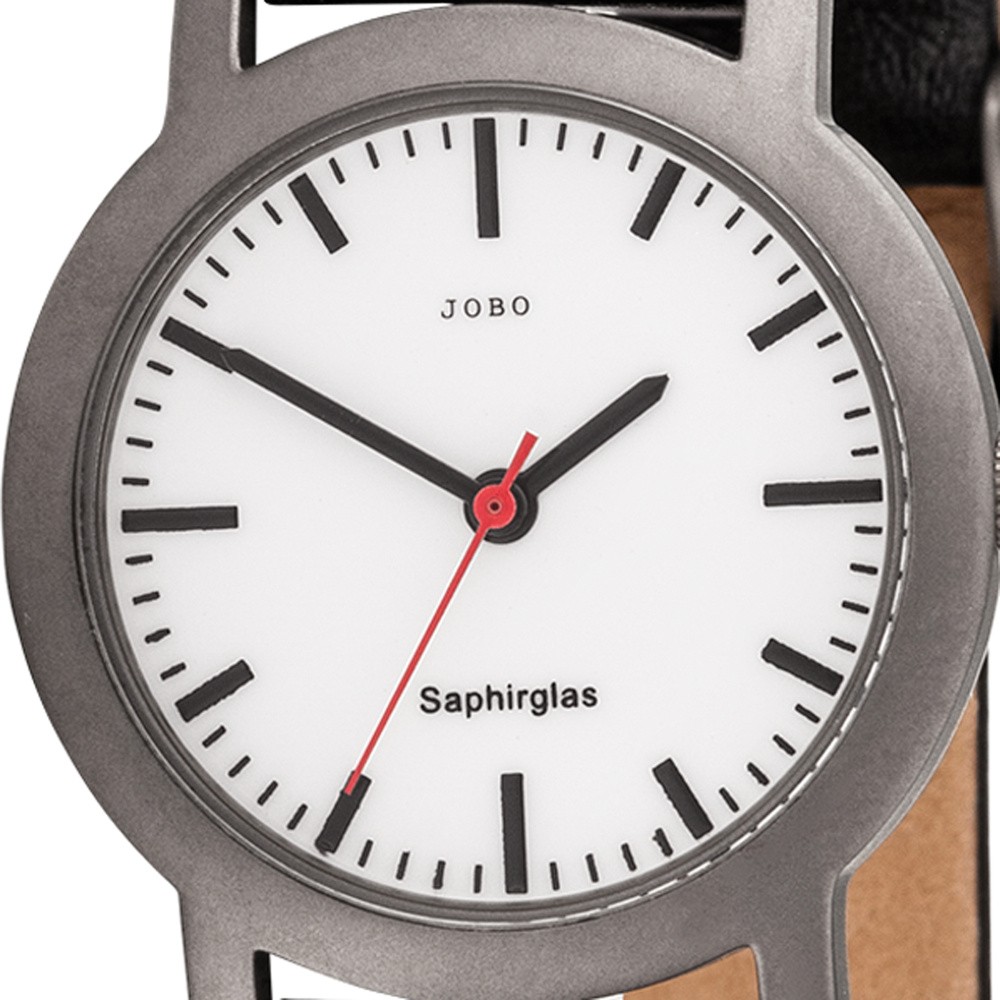JOBO Damen Armbanduhr Quarz Analog Titan Lederband schwarz DamenuhrDamenarmbanduhr der Marke JOBO- Quarz-Analog- Gehäuse und Boden Titan- mattiert- Safirglas- rote Zentralsekunde- weißes Zifferblatt- wassergeschützt bis 5 ATM- schwarzes Lederband mit Dornschließe- Schweizer Ronda-Werk- Bandlänge ca. 19 cm