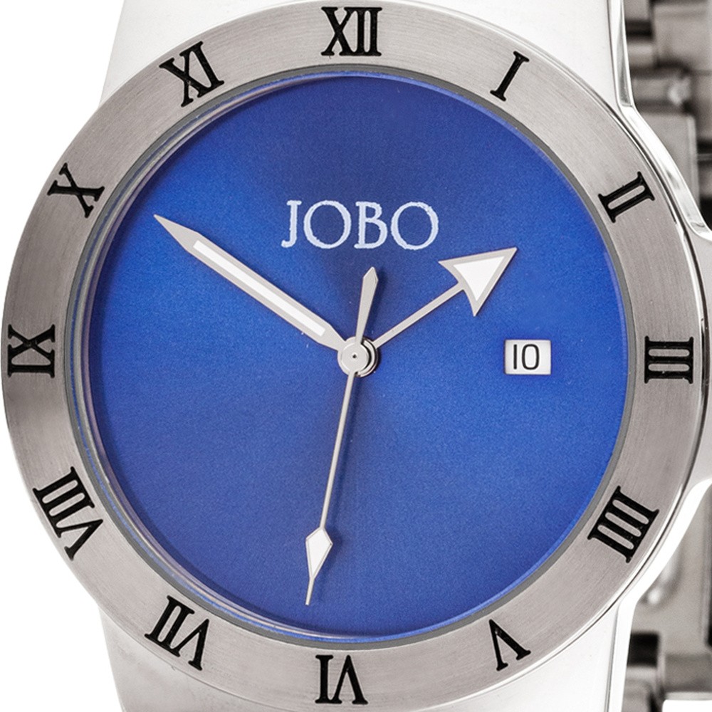 JOBO Herren Armbanduhr blau Quarz Analog Edelstahl Datum HerrenuhrHerrenarmbanduhr der Marke JOBO- Quarz-Analog- mit Gehäuse- Band und Boden aus teilmattiertem Edelstahl- mit blauem Zifferblatt und römischen Ziffern- mit Mineralglas- Zentralsekunde und Datumsanzeige- wasserdicht bis 10 ATM- mit Faltschließe- verkürzbar- ausgestattet mit Schweizer Ronda-Werk- Bandlänge ca. 21.5 cm