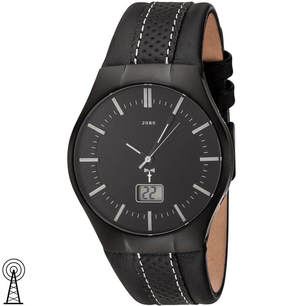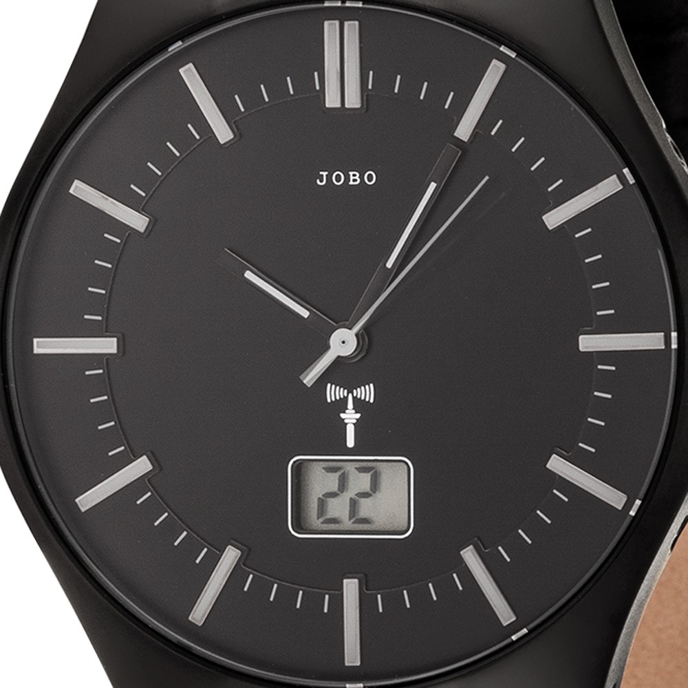 JOBO Herren Armbanduhr Funk Funkuhr Edelstahl Lederband schwarz Herrenuhr DatumHerrenarmbanduhr der Marke JOBO- Funkuhr- Gehäuse und Boden Edelstahl- schwarz plattiert- mattiert- Mineralglas- Zentralsekunde- digitale Datums- oder Tagesanzeige- schwarzes Zifferblatt- wassergeschützt bis 3 ATM- schwarzes Lederband mit Dornschließe- Bandlänge ca. 21 cm