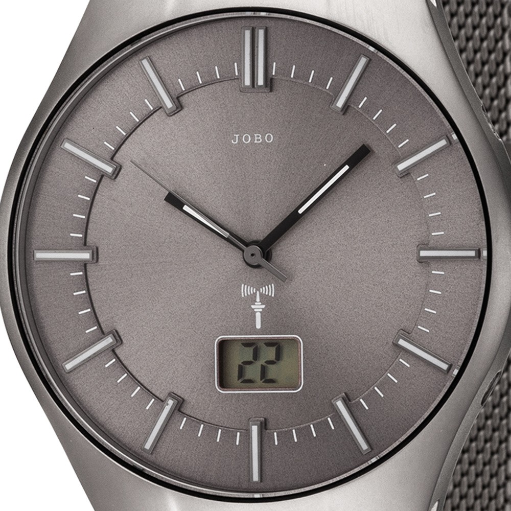 JOBO Herren Armbanduhr grau Funk Funkuhr Edelstahl Herrenuhr mit DatumHerrenarmbanduhr der Marke JOBO- Funkuhr- Gehäuse- Band und Boden Edelstahl- mattiert- Mineralglas- Zentralsekunde- digitale Datums- oder Tagesanzeige- graues Zifferblatt- wassergeschützt bis 3 ATM- mit Klappverschluss- verkürzbar- Bandlänge ca. 21 cm