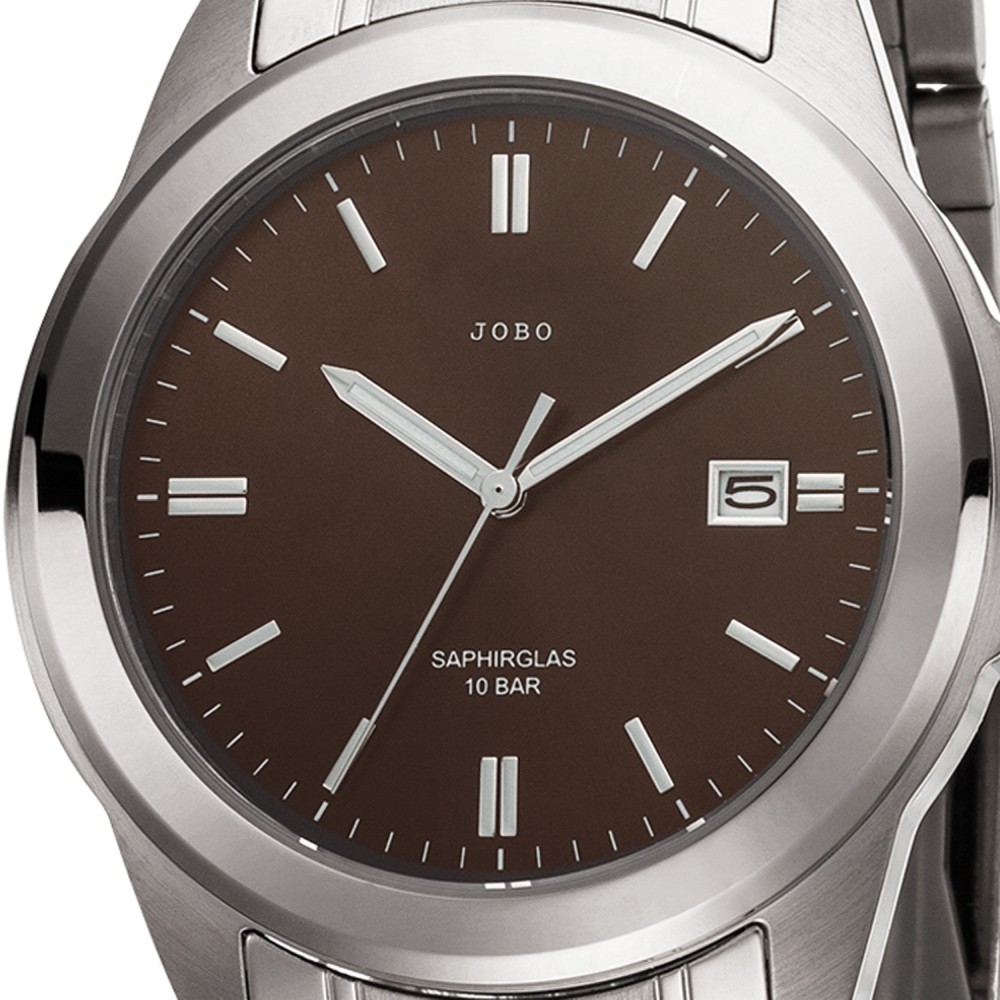 Herrenarmbanduhr der Marke JOBO, Quarz-Analog, Gehäuse, Band und Boden Edelstahl, teilmattiert, Safirglas, Zentralsekunde, Datumsanzeige, braunes Zifferblatt, Strichskala, wasserdicht bis 10 ATM, Faltschließe, verkürzbar, Bandlänge ca. 21 cm