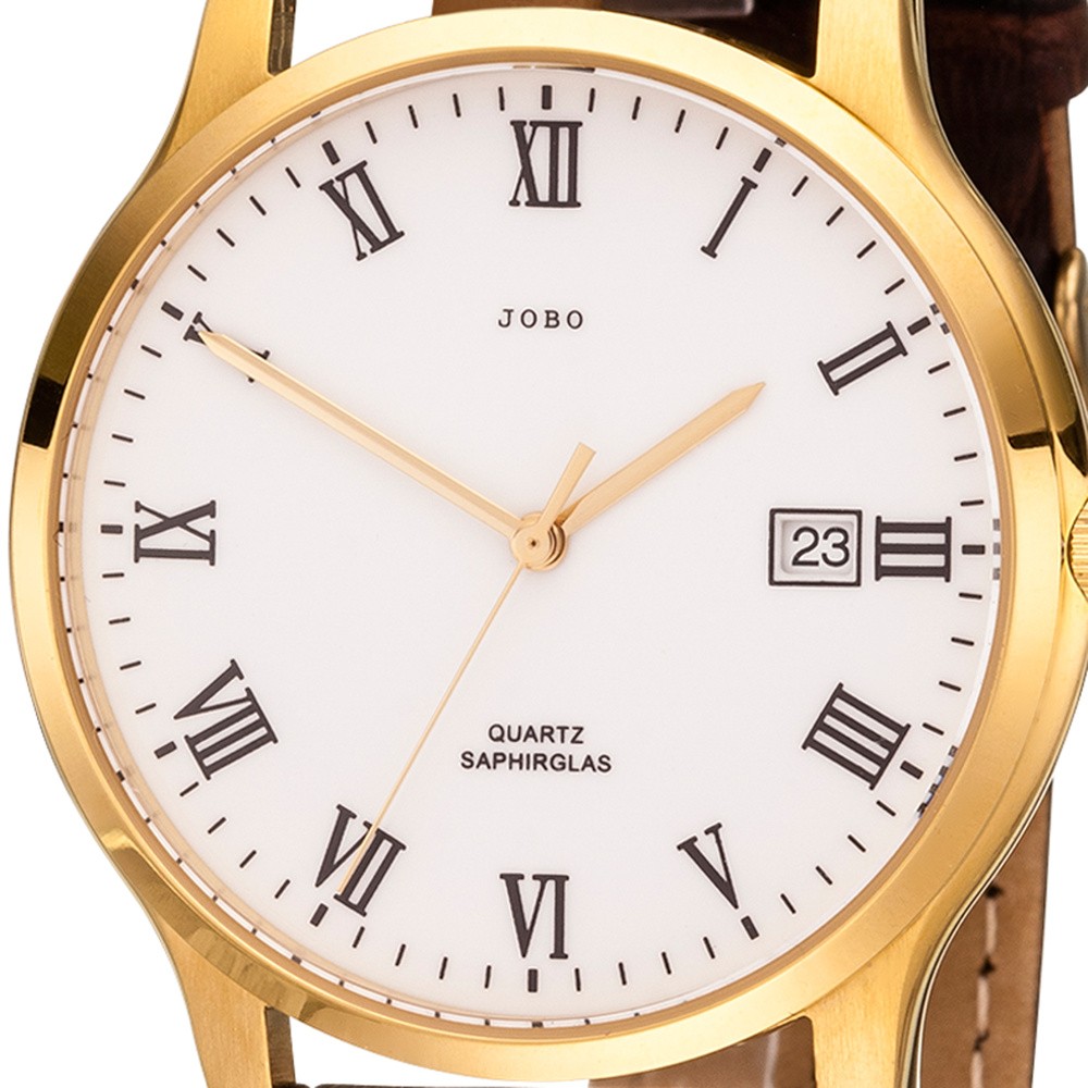 Weiterführende Links zu "JOBO Herren Armbanduhr Quarz Analog Edelstahl vergoldet Lederband braun Datum"
