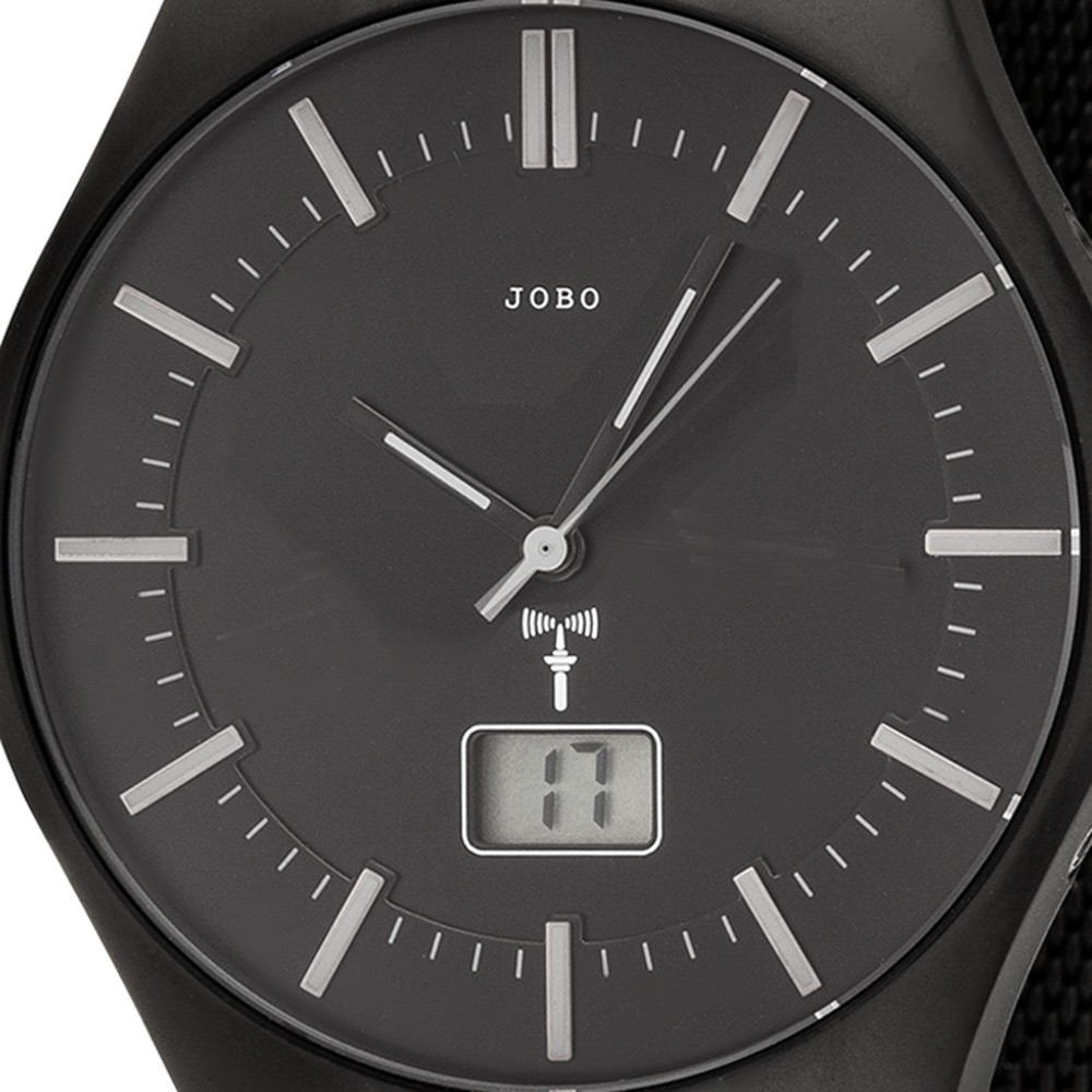 JOBO Herren Armbanduhr schwarz Funk Funkuhr Edelstahl Herrenuhr mit DatumHerrenarmbanduhr der Marke JOBO- Funkuhr- Gehäuse- Band und Boden Edelstahl- schwarz plattiert- mattiert- Mineralglas- Zentralsekunde- digitale Datums- oder Tagesanzeige- schwarzes Zifferblatt- wassergeschützt bis 3 ATM- mit Klappverschluss- verkürzbar- Bandlänge ca. 21 cm