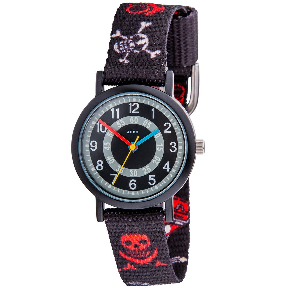 JOBO Kinder Armbanduhr Totenkopf Pirat Quarz Analog Aluminium KinderuhrKinderarmbanduhr der Marke JOBO- Quarz-Analog- Gehäuse Aluminium schwarz- Edelstahlboden- Mineralglas- Zentralsekunde- wassergeschützt bis 3 ATM- schwarz/rot/weißes Band mit Totenköpfen und Dornschließe- Bandlänge ca. 18 cm