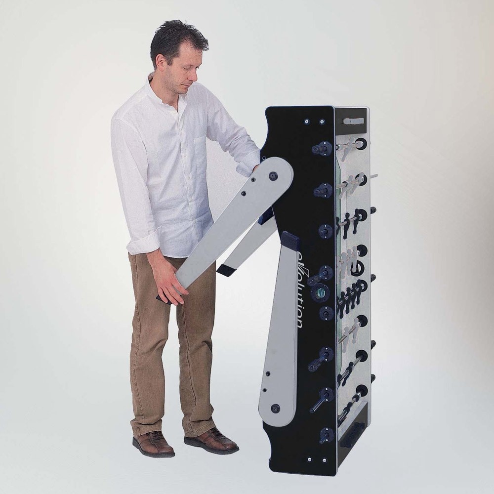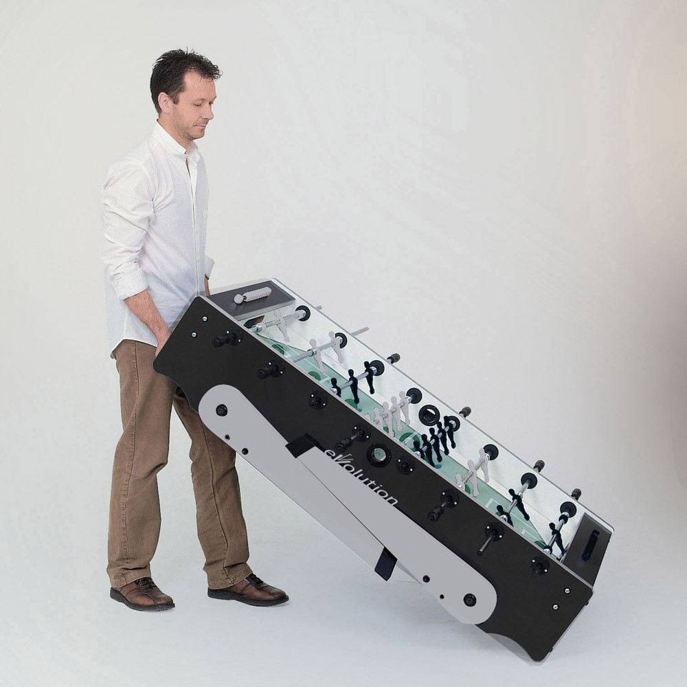 Der Schulkicker FOLDY EVO ist ein echtes Raumwunder, denn die klappbaren 40 mm starken Füße erlauben es, den Fußballtisch nach Gebrauch zusammenzuklappen und diesen beiseite zu stellen.Gummikanten erlauben eine sichere Stütze des senkrechten Tisches und die eingebauten Rollen garantieren einen einfachen Transport. In sportiver Farbkombination schwarz/silber ist dieser hochwertige Tischkicker FOLDY EVO mit einer MDF-Korpuswandstärke von 25 mm ausgestattet, deren Oberfläche über eine absolut resistente Melaminoberfläche verfügt und mit Balleinwurfschalen an den Stirnseiten versehen ist. Besonders belastbar sind die Spielstangen aus verchromtem und rostfreiem Stahl (Ø 16 mm) mit ergonomischen Kunststoffgriffen. Hochwertige Kugellager garantieren eine hohe Leichtgängigkeit der Stangen. Die Torwarte sind 360° rotierend. Das Spielfeld ist aus grünem Laminat und weiß liniert.