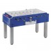 Tischkorpus - Qualitativ hochwertiger Tischkicker mit 25mm starkem Mehrschichtholz-Korpus dessen Oberfläche über eine robuste, wetterbeständige Melaminbeschichtung verfügt. Das unempfindliche und attraktive blau/ silber OUTDOOR Dekor ist mit stoßfesten Aluminium Kanten ausgestattet. Die Tischabdeckung aus gehärtetem Sicherheitsglas (Thermisch vorgespanntes Einscheiben-Sicherheitsglas), die Geräusche reduziert und das Gerät sauber hält, ist, wie der komplette Tisch leicht zu reinigen. Der ideale, robuste Tischkicker für den Outdoor-Bereich, geeignet für Jugendräume / Schulen, Vereinsheime und offizielle Einrichtungen, die auch außen Flächen zur Freizeitgestaltung bieten. Stabile 16mm (Wandstärke 2,2mm) verchromte Spielstangen mit schwarzen ERGO-Kunststoffgriffen die in Stahl-Kugellagern laufen. Die nahezu unzerbrechlichen Spieler sind fest auf die Stangen gegossen, sowie zur Korpuswand hin mit Distanzfedern gedämpft. 360° frei rotierender Torwart. Das Laminat Spielfeld, Abmessungen 120 x 70 cm, ist grün mit weißen Linien sowie aufgesetzten Kunststoff-Ecken und wetterfest. Stabile 90 x 90mm eckige Tischbeinkonstruktion aus silber lackiertem Metall sowie integrierten Höhenverstellern zum Niveauausgleich. Die zentrale Ballentnahme wird durch eine Ballführung ergänzt. Somit bleiben alle Kickerbälle wo sie hingehören - keine Einzelentnahme möglich.