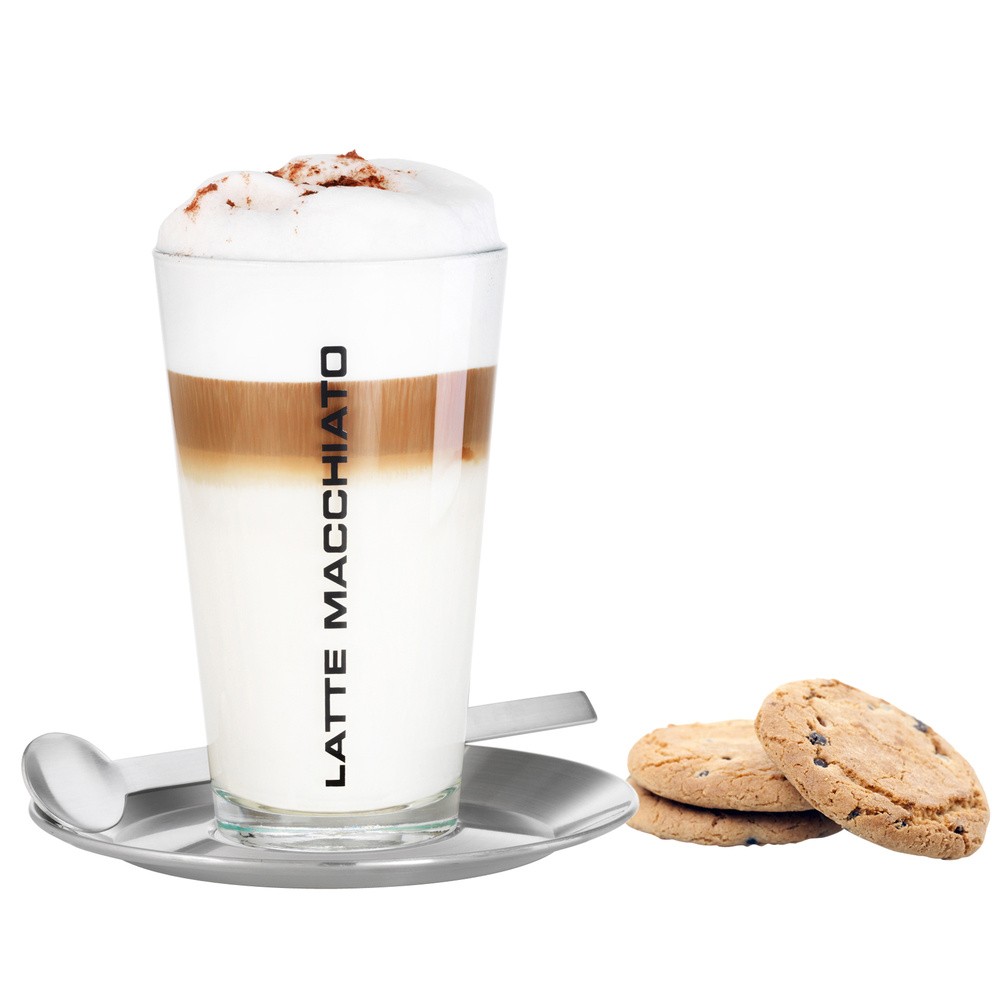 Latte Macchiato Set CONO, 3-teiliges Set bestehend aus 1 Glas, ca. 350 ml Inhalt, 1 Teller und 1 Löffel, Edelstahl matt