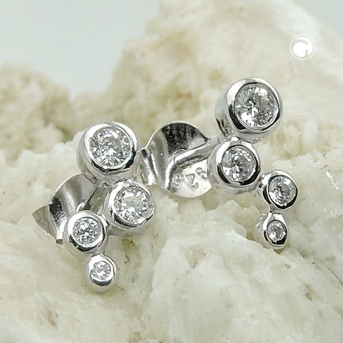 Wunderschöner Ohrstecker mit Zirkonias aus 925/- Sterlingsilber, gearbeitet in hochwertiger Juwelierqualität - ein Schmuckstück für viele Gelegenheiten! Bei diesem 9x3mm großen, zeitlos schönen Ohrring funkeln 4 unterschiedliche große weiße Zirkonias in Zargenfassung seitlich versetzt untereinander. Mit nur einem Steckerloch funkeln gleich 4 Zirkonias im Diamantschliff am Ohr. Für langanhaltende Freude an diesem Ohrschmuck wurde die Oberfläche anlaufgeschützt rhodiniert.