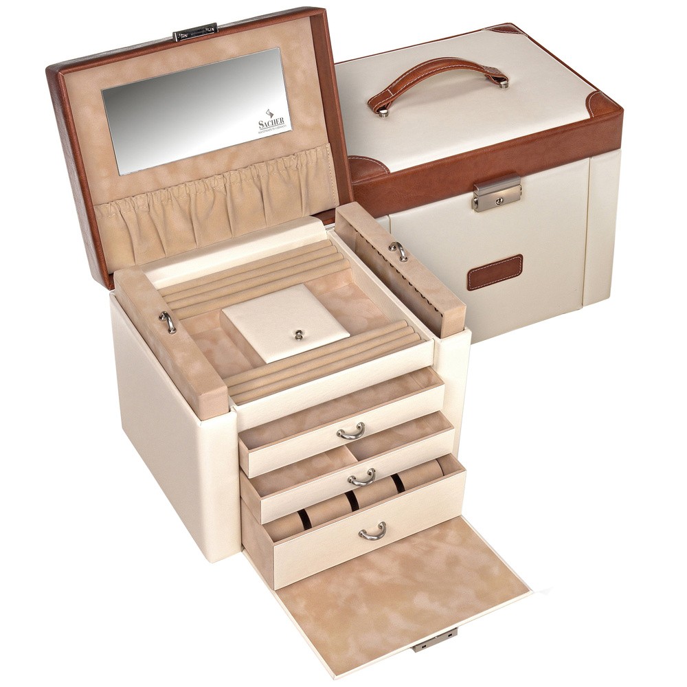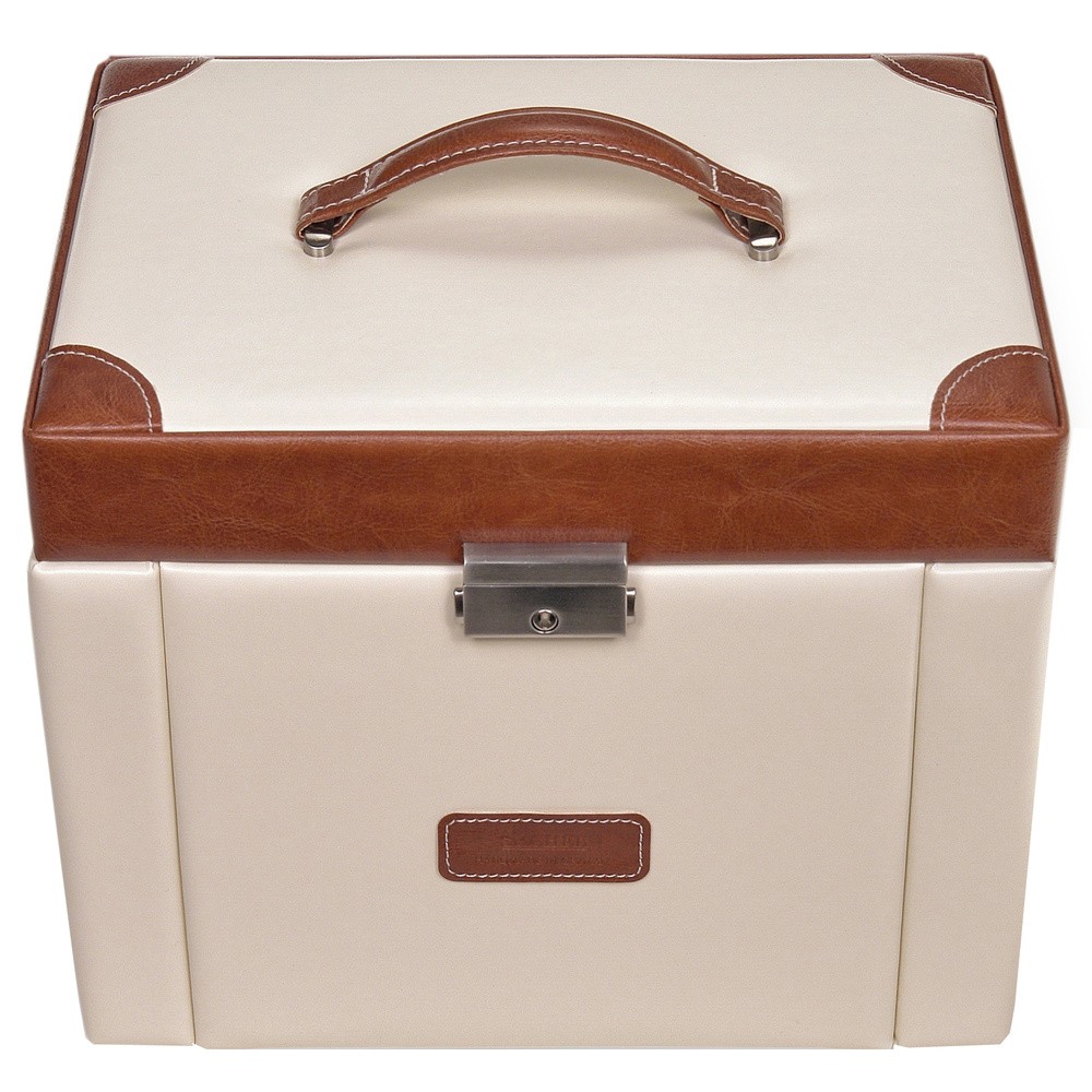 Schmuckkoffer Travel, Lederimitat creme/braun, innen hochwertiger Veloursamt beige, ausgestattet mit 2 Ringpolster und 3 kleineren Fächern (1 davon mit Klappdeckel) im oberen Fach, 3 geräumige Schubfächer, 1 davon geteilt, 1 Fach mit 4 federnden Uhrenspangen, 2 herausnehmbare Seitenfächer mit je 17 Haken für Ketten, Spiegel im Deckel mit Rüschentasche, mit Tragegriff und abschließbarem Schloss