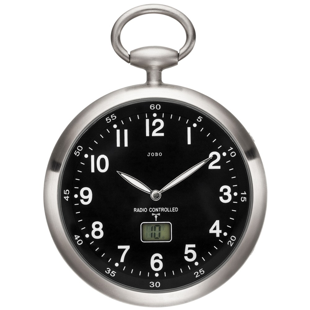 Taschenuhr der Marke JOBO, Funkuhr, Edelstahl mattiert, Mineralglas, digitale Datums- /Sekunden- oder Tagesanzeige, schwarzes Zifferblatt, arabische Zahlen, wassergeschützt bis 3 ATM