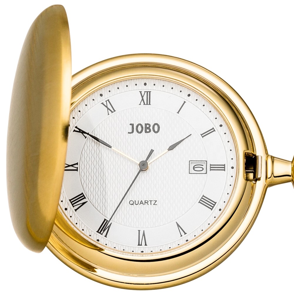 Taschenuhr der Marke JOBO, Quarz-Analog, vergoldet, teilmattiert, Sprungdeckel, Zentralsekunde, Datumsanzeige, römische Ziffern, Punktskala