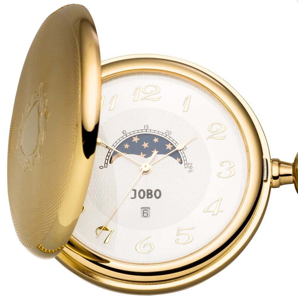Taschenuhr der Marke JOBO, Quarz-Analog, vergoldet, Sprungdeckel, Zentralsekunde, Datumsanzeige, Tag-/Nachtanzeige, arabische Zahlen