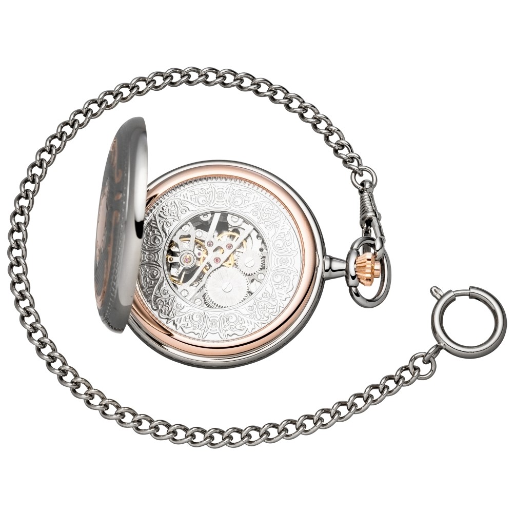 Taschenuhr Skelett mit Kette Handaufzug bicolor 2 Sprung-Deckel