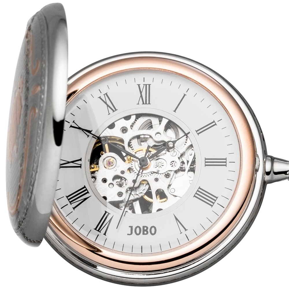 Taschenuhr, JOBO-Handaufzug, verchromt, rosé teilplattiert, Doppel-Sprungdeckel, Zentralsekunde, beidseitig sichtbares Skelettwerk, römische Ziffern, Strichskala