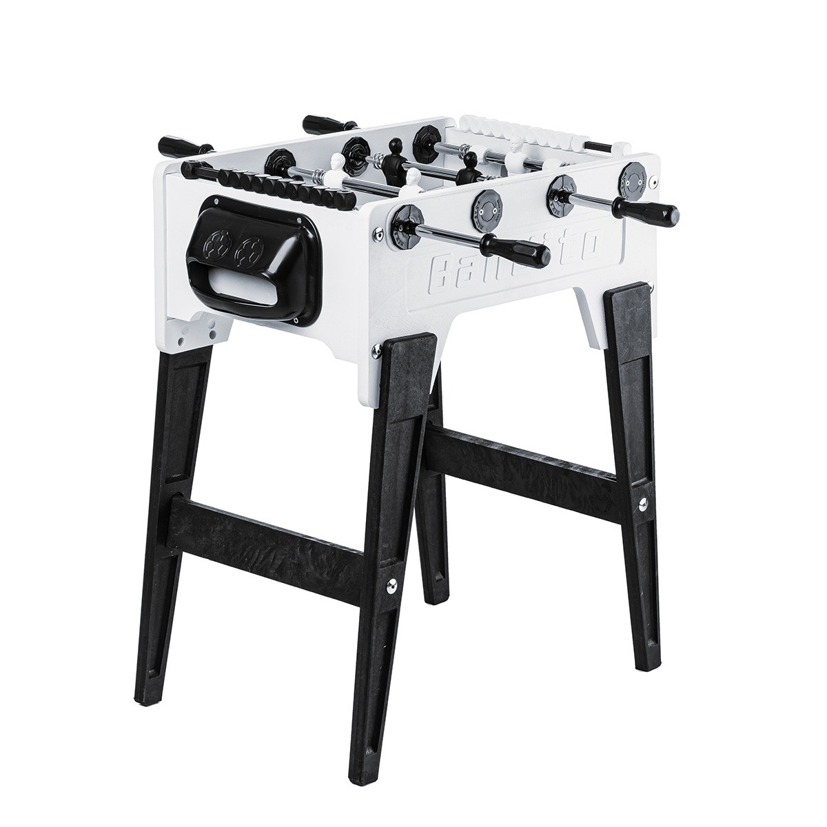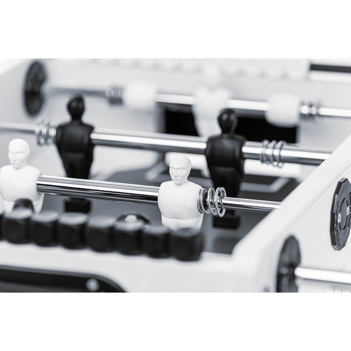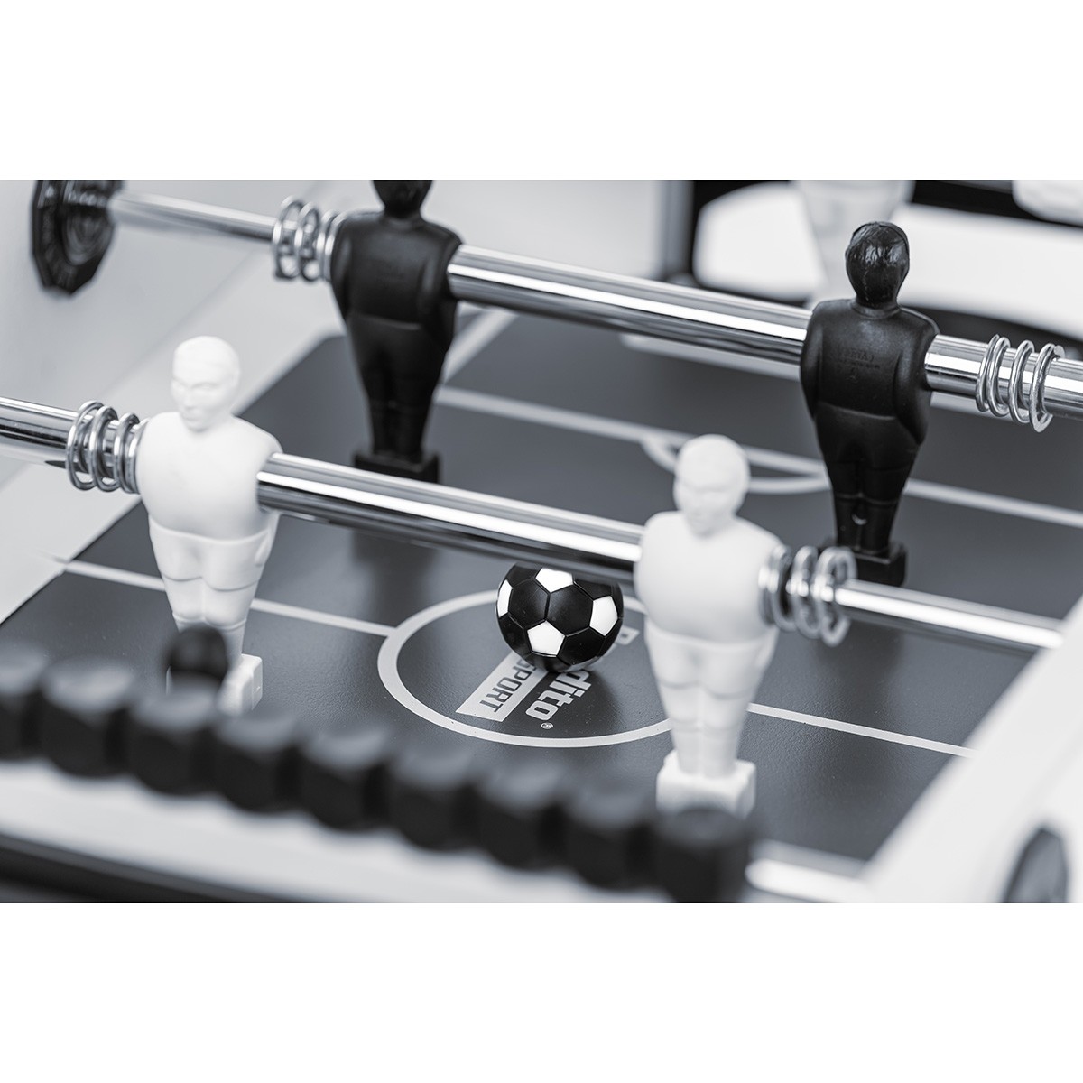 Der hochwertige robuste Korpus ist aus thermoplastischem Kunstharz mit Fiberglas Verbundstoffen gefertigt und das anthrazit-schwarze Spielfeld besteht aus wasserresistentem Melamin. Dadurch kann dieser Tischkicker sowohl Outdoor als auch Indoor genutzt werden.