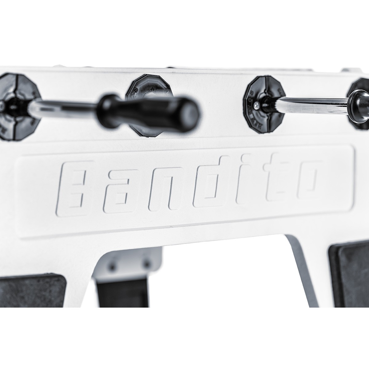 Auch die 16 Millimeter starken Spielstangen sowie alle anderen Metallteile und Verschraubungen sind aus Edelstahl wetterfest. Die stabilen Tischbeine die mit einer zusätzlichen Querstrebe verbunden sind können mit wenigen Handgriffen von 86 auf 78 Zentimeter Tischhöhe verstellt werden. Damit ist dieser Family-Kickertisch für Erwachsene und Kinder gleichermaßen geeignet. Alle Gehäusekanten sind abgerundet und zur weiteren Sicherheit ist der Bandito Fun mit Safety-Teleskopstangen ausgestattet. Alle Bauteile entsprechen den Europäischen Sicherheitsnormen. Durch die kompakte Bauweise und einem Gewicht von nur 16 Kilogramm kann der handliche Kicker von einer Person ganz einfach transportiert werden.