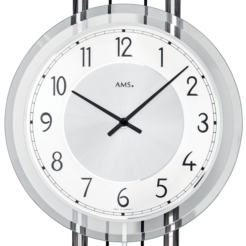 - Gewicht ca. 1065.4gWeiterführende Links zu "AMS 7464 Wanduhr Quarz mit Pendel Pendeluhr silbern mit Holz und Glas"